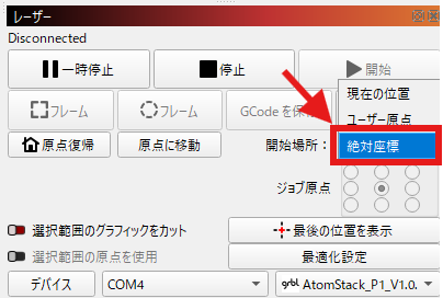 - LightBurnを起動し、開始場所を[絶対座標]に設定します。