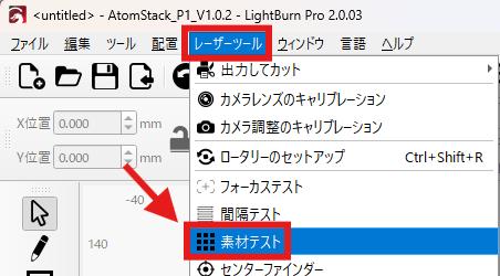 - メニューの「レーザーツール」から[素材テスト]を選択します。