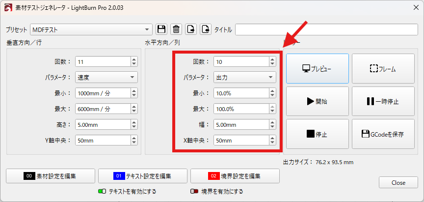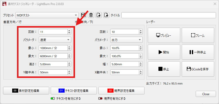 大きなMDF板を使えない場合や、端材(切れ端)で試したい場合には、テスト範囲を小さく設定できます。