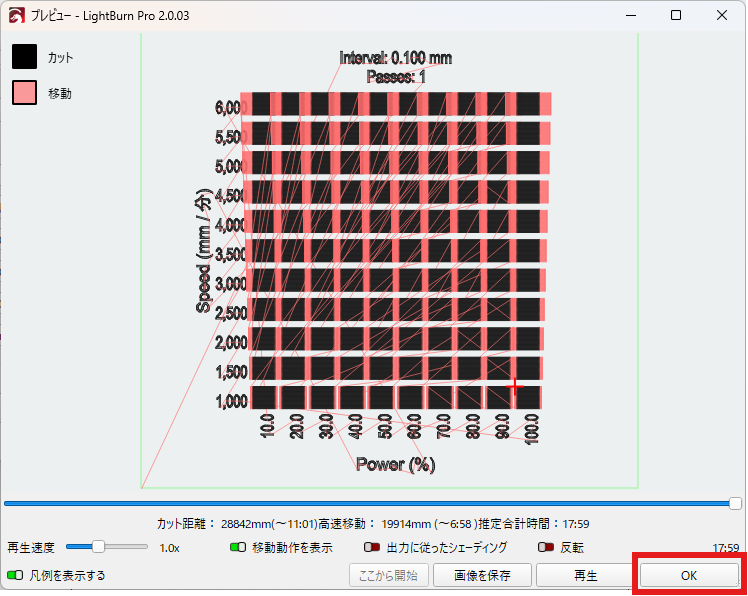 素材テストとは、彫刻する際のスピード(加工速度)とパワー(レーザー出力)の組み合わせを試し、その素材に最適な設定を見つけるためのテストです。